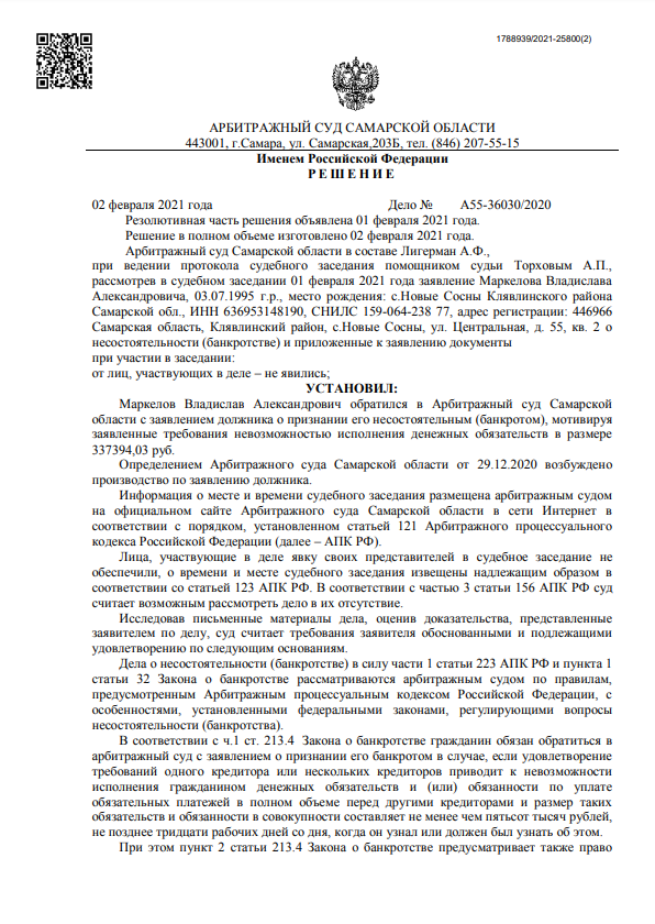 Арбитражный суд Самарской области в составе Лигерман А.Ф., при ведении протокола судебного заседания помощником судьи Торховым А.П., рассмотрев в судебном заседании 01 февраля 2021 года заявление Маркелова Владислава Александровича, 03.07.1995 г.р., место рождения: с.Новые Сосны Клявлинского района Самарской обл., ИНН 636953148190, СНИЛС 159-064-238 77, адрес регистрации: 446966 Самарская область, Клявлинский район, с.Новые Сосны, ул. Центральная, д. 55, кв. 2 о несостоятельности (банкротстве) и приложенные к заявлению документы при участии в заседании: от лиц, участвующих в деле – не явились; УСТАНОВИЛ: Маркелов Владислав Александрович обратился в Арбитражный суд Самарской области с заявлением должника о признании его несостоятельным (банкротом), мотивируя заявленные требования невозможностью исполнения денежных обязательств в размере 337394,03 руб.[...]